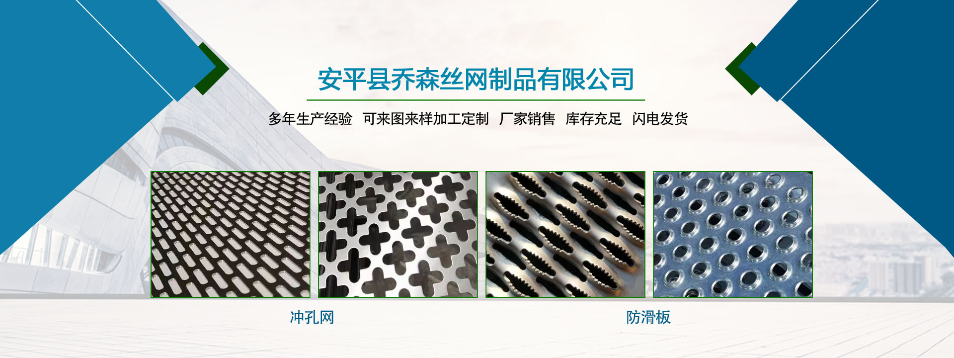喬森絲網成立于2014年9月,位于中國絲網之鄉(xiāng)-河北省安平縣,是一家專注于生產金屬絲編織網、金屬網板沖孔及相關金屬裝飾絲網深加工產品的企業(yè)。從一個家庭式的小工坊到公司多年來,一直本著以“質量求生存,信譽謀發(fā)展”的生產原則兢兢業(yè)業(yè)穩(wěn)步向前,贏得了 一大批忠實客戶的廣泛贊譽。然騏驥一躍,不能十步,駑馬十駕,功在不舍。我們將以更周到的服務,更過硬的質量,不忘初心,為廣大的客戶提供更優(yōu)質的服務。